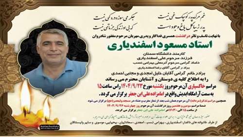 درگذشت همکار گرانقدر، مهندس مسعود اسفندیاری مراسم خاکسپاری همکار گرانقدر، مهندس مسعود اسفندیاری 1404/09/23 - 10:52 تعداد بازدید: 197 کلمات کلیدی